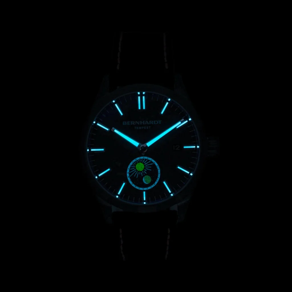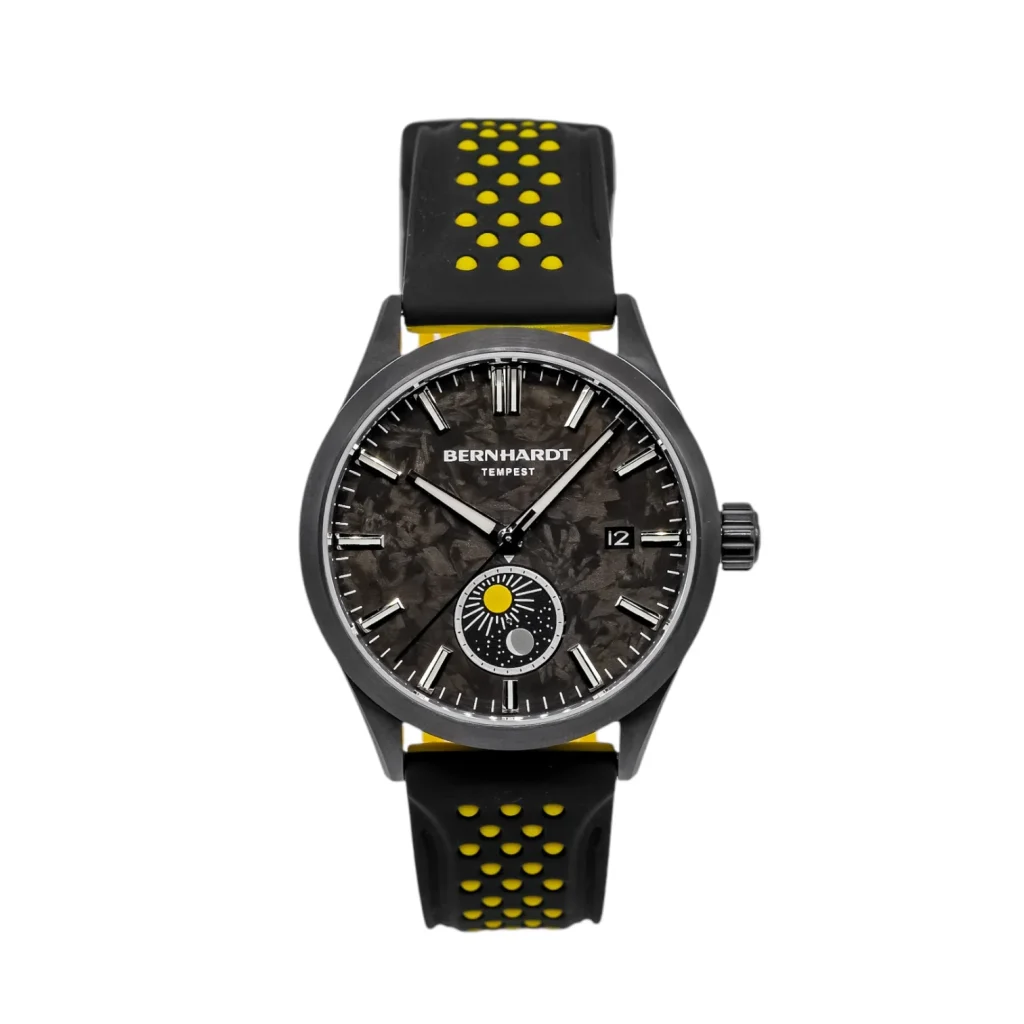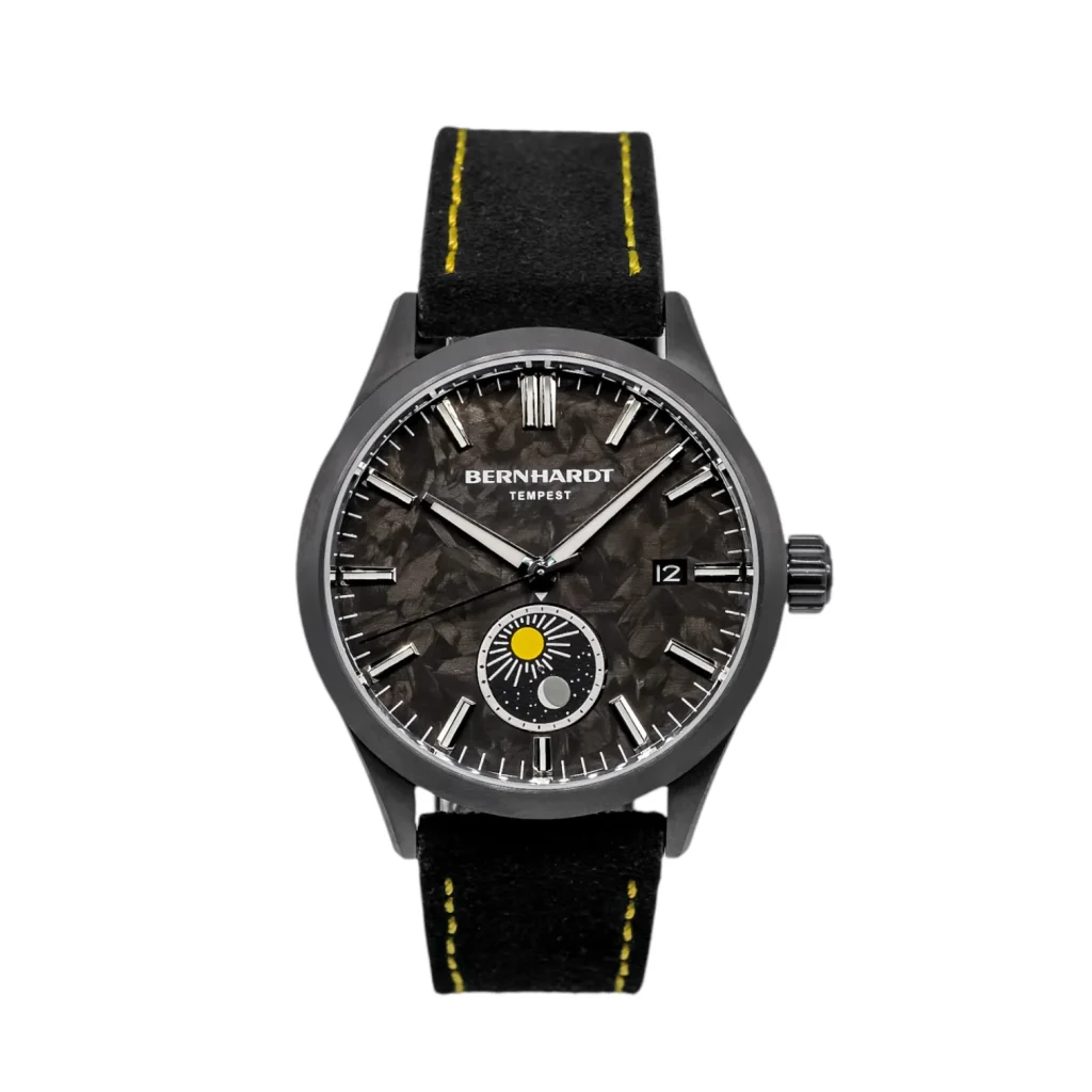 The Tempest from Bernhardt Watch Co.’s Horizon Collection blends rugged elegance with high-performance engineering. Its standout forged carbon dial ensures no two are identical, while the titanium carbide PVD-coated case provides durability. Powered by a modified Miyota 9132 automatic movement with a day/night indicator, it offers precision at +/- 5 seconds per day. Key features include a double-coated AR sapphire crystal, 100m water resistance, and interchangeable straps. Assembled in the USA, the Tempest is ideal for those seeking unique sophistication.