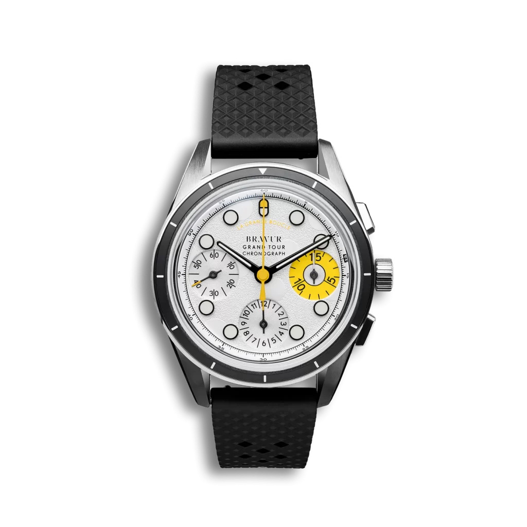 Introducing the Grand Tour – La Grande Boucle IV, a beautifully crafted automatic watch handbuilt in Båstad, Sweden. This timepiece features a 38.2mm stainless steel case, a domed sapphire crystal with an anti-reflective coating, and a Swiss Made Sellita SW511b movement with a 62-hour power reserve. The silver white dial showcases a tarmac texture with a polka dot pattern and Super-LumiNova infilled indices. Available with multiple strap options, it offers 10 ATM water resistance.