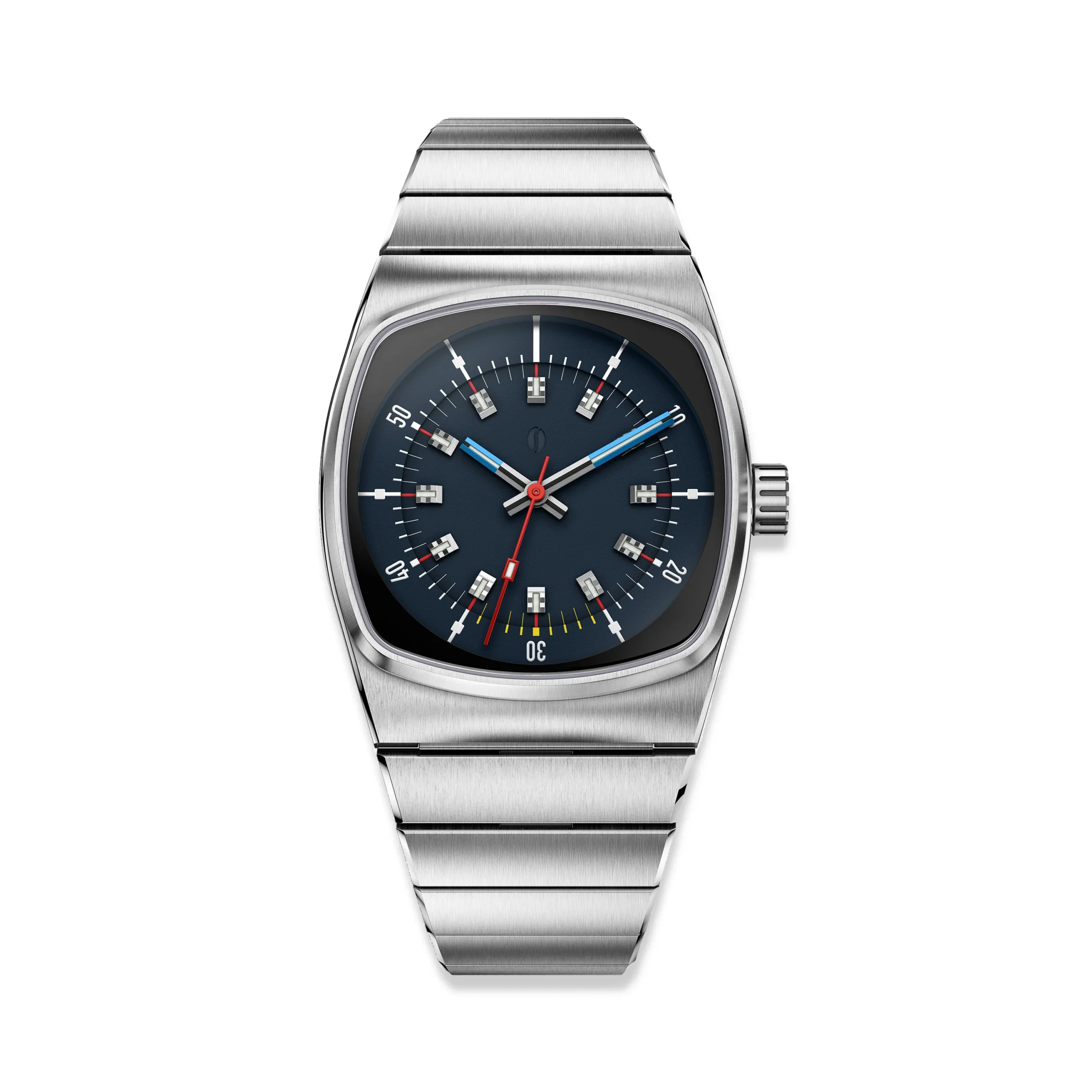 The Brew Metric Manual Wind Blue offers a classic, slim 1970s-style design with a 36mm case. Its blended steel and contrasting brushed components give it an industrial aesthetic. The watch features a tactile hand-wound Swiss movement, visible through a sapphire exhibition caseback, which provides a 42-hour power reserve. The crown is newly designed for a crisp, audible click when winding.
