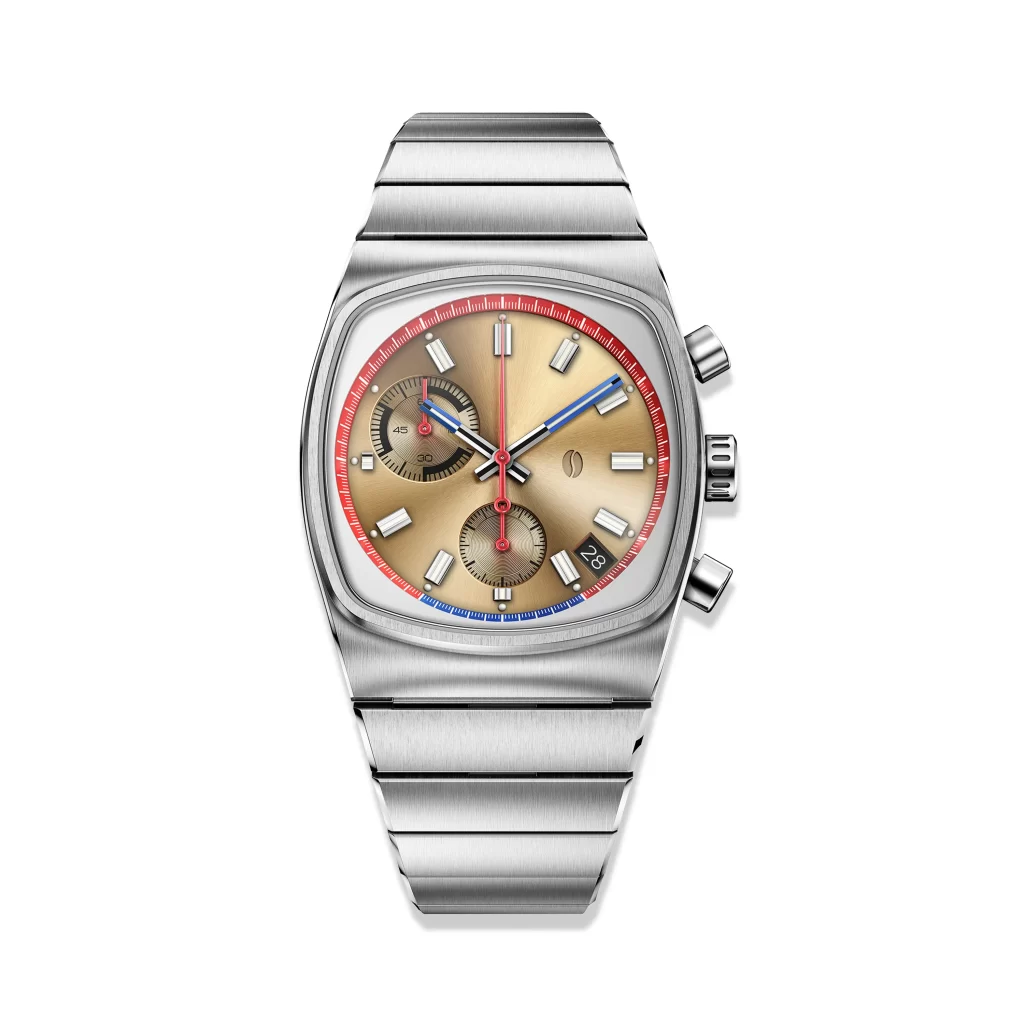 The Metric – Star watch radiates timeless elegance with a modern touch, merging vintage-inspired aesthetics with high functionality. The brushed gold sunray dial, highlighted by recessed subdials, adds depth and sophistication to this 36mm x 41.5mm stainless steel case. Powered by a VK68 Meca-Quartz hybrid chronograph movement and protected by scratch-resistant sapphire glass, this piece balances form and function. Its 5ATM water resistance and stainless steel band with a folding clasp make it a reliable choice for everyday elegance.