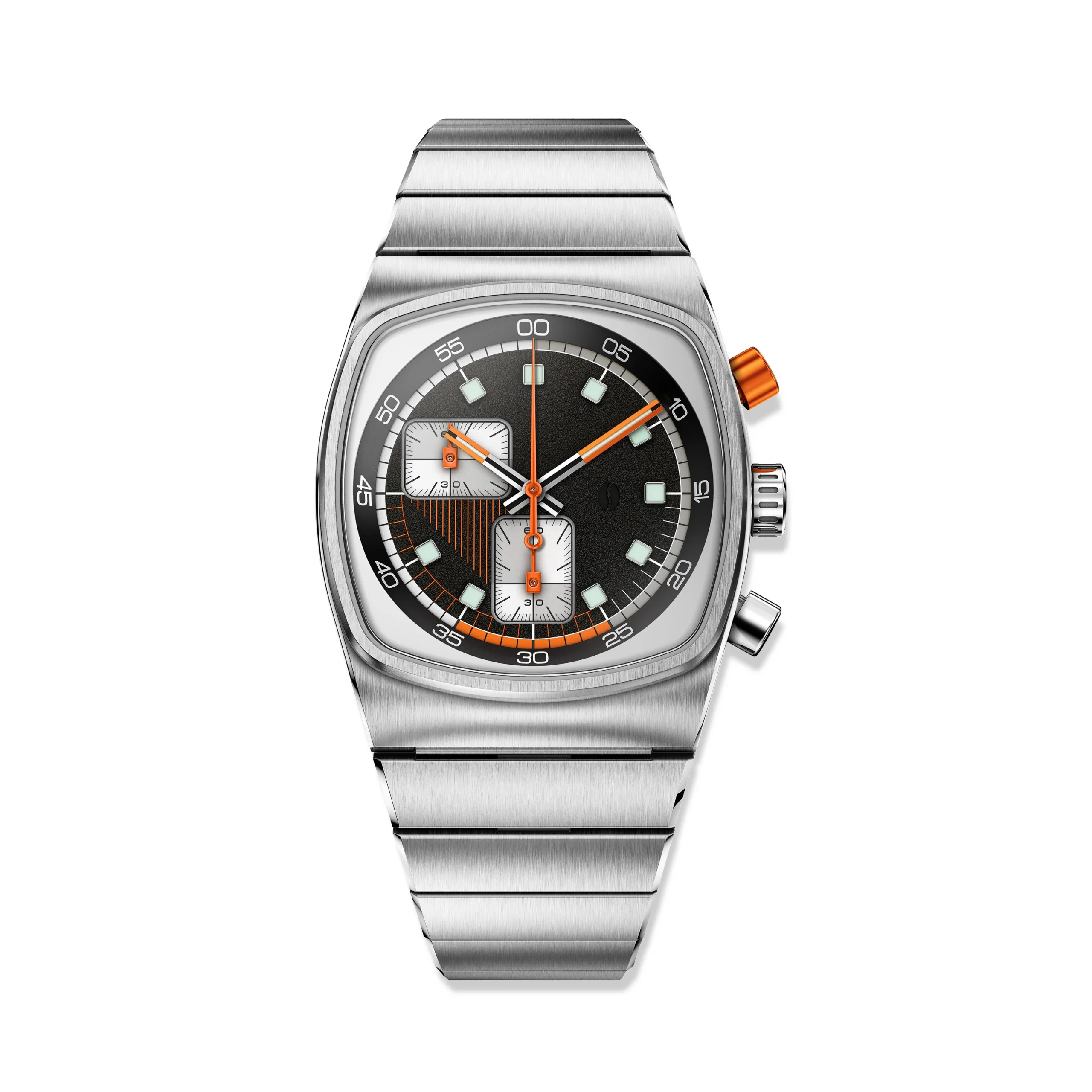 The Brew Super Metric stands out with its compact 36mm x 41.5mm 316L stainless steel case, housing a hybrid VK68 meca-quartz chronograph movement. The burnt orange dial features fine-texture detailing and recessed square subdials for a retro-modern appeal. A sapphire crystal adds durability, while the quick-release stainless steel bracelet ensures convenience and comfort. Water-resistant up to 50 meters, this stylish chronograph combines precision and design for everyday elegance.