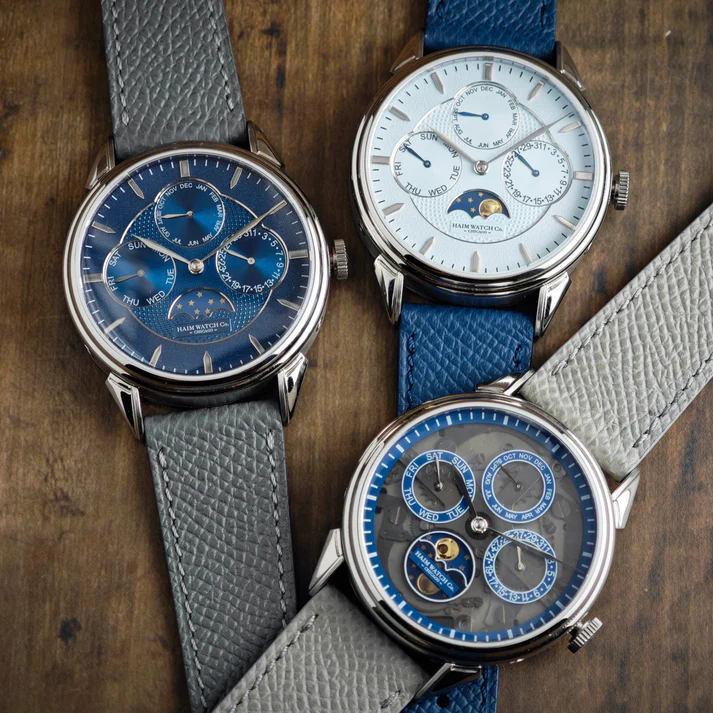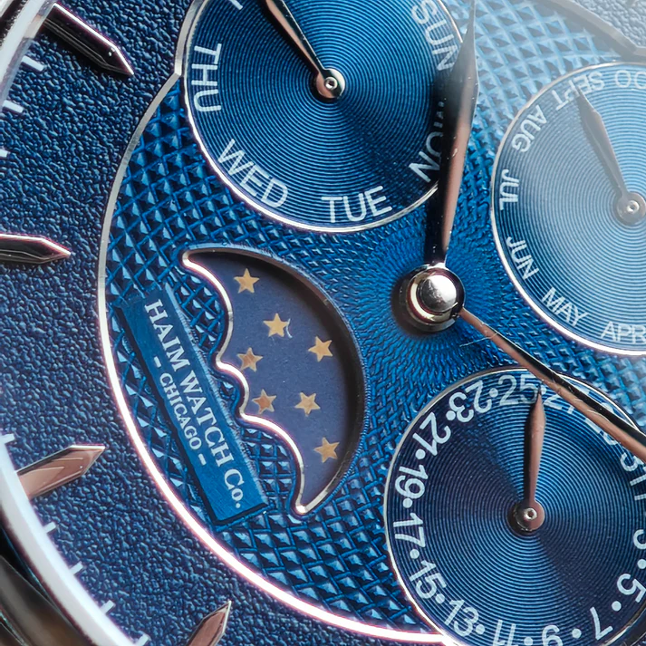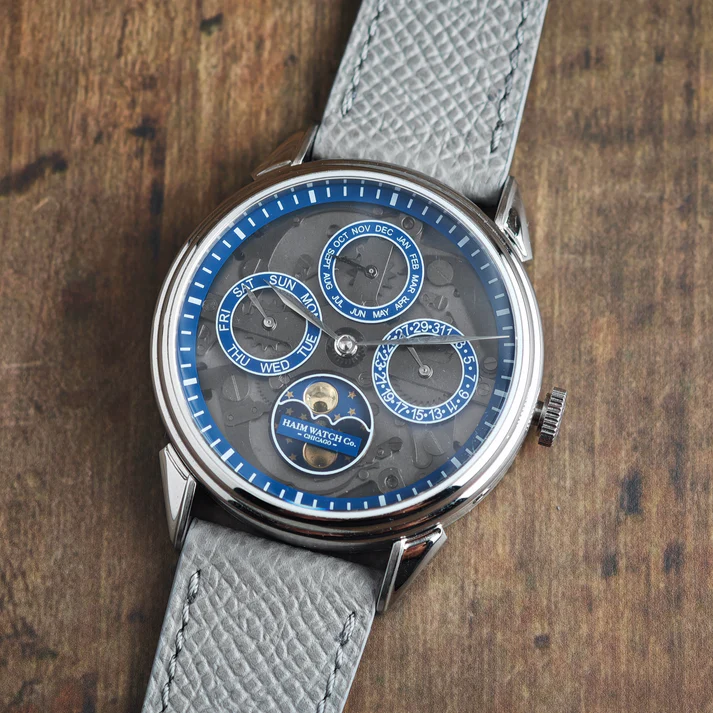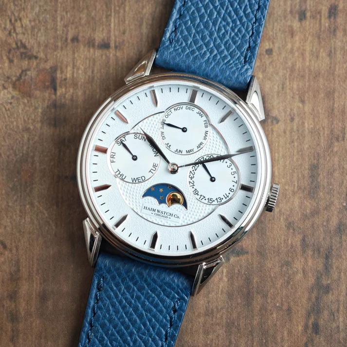 Haim Watch Company is launching the Annum, an elegant annual calendar with moonphase that represents the brand’s second complication-based timepiece and debuts their custom mechanical Caliber HWC-2. Drawing on neo-vintage aesthetics, the 38mm stainless steel watch features an updated “Cornes de Vache”-inspired lug design and a dial with applied markers and either CNC guilloché or a fumée finish.