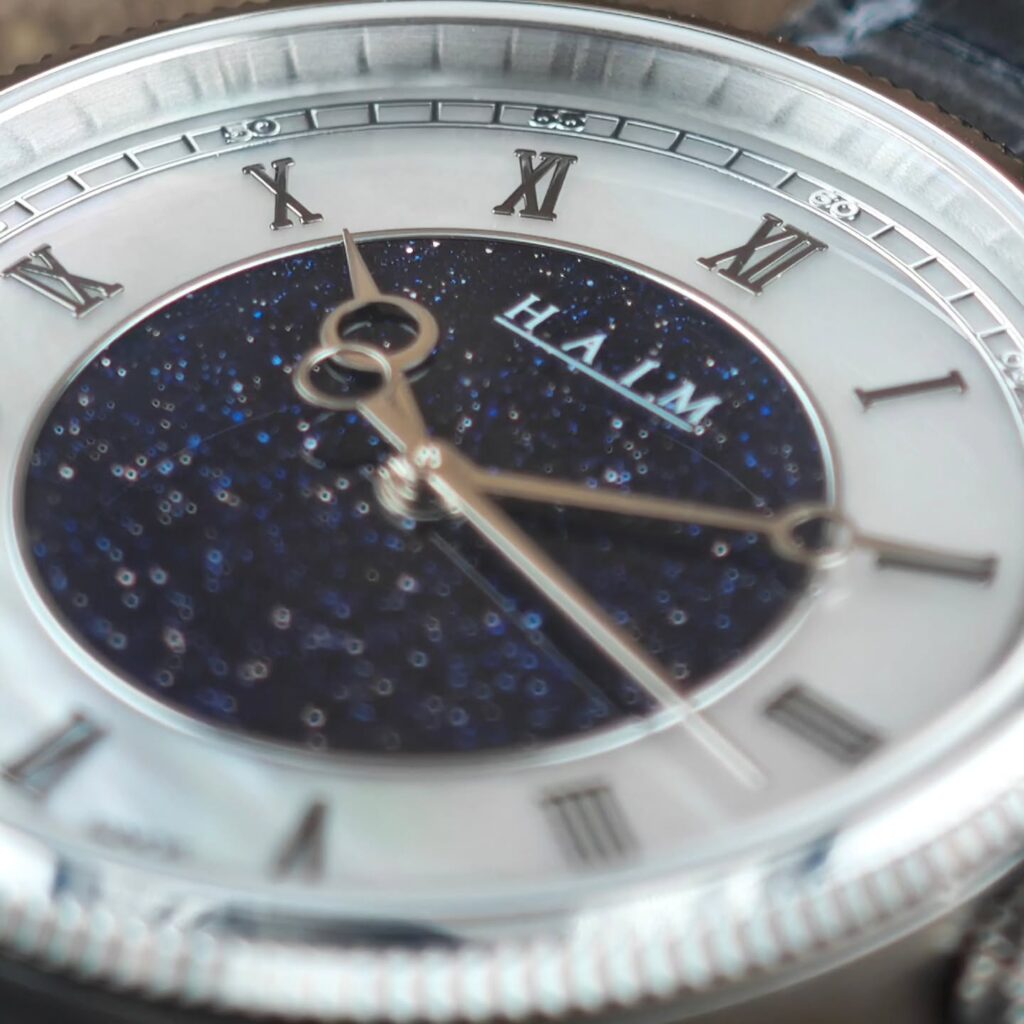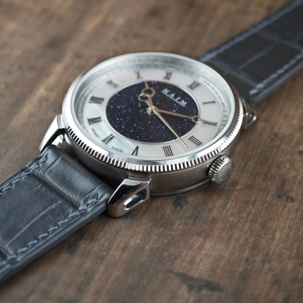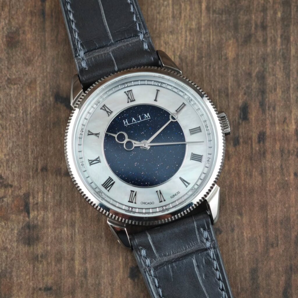Haim Watch Company introduces the exquisite Legacy Automatic: Starry Pearl, a time-only design that marks several firsts for the brand. This limited edition of 25 pieces features a stunning new Aventurine dial with an outer Mother of Pearl ring, complemented by applied pewter-colored Roman numerals. Cased in hand-finished, hardened Titanium TA2 with unique hollowed lugs and a subtle coin edge bezel, the Starry Pearl is powered by Haim’s first custom mechanical caliber, the HWC-01, which is 100% US assembled and visible through an exhibition caseback.