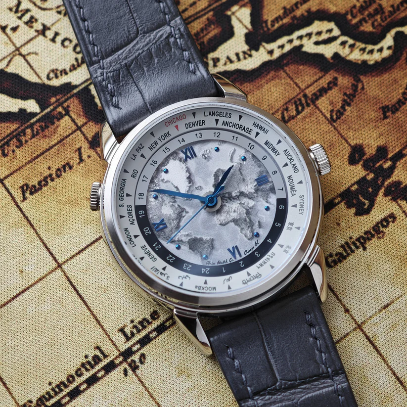Introducing the Viajero: Global Citizen by Haim Watch Company, a limited-edition timepiece blending meticulous craftsmanship with a globally inspired design. Housed in a 38.5mm hand-finished stainless steel case, it features a sapphire crystal with five layers of anti-reflective coating and an exhibition caseback showcasing the custom Atlas-shaped rotor. The monochromatic dial is accented with thermal blued hands and hour markers, while the bezel uniquely displays city names in their native languages. Powered by the NH34A movement, this worldtimer GMT is designed for travelers and enthusiasts alike.