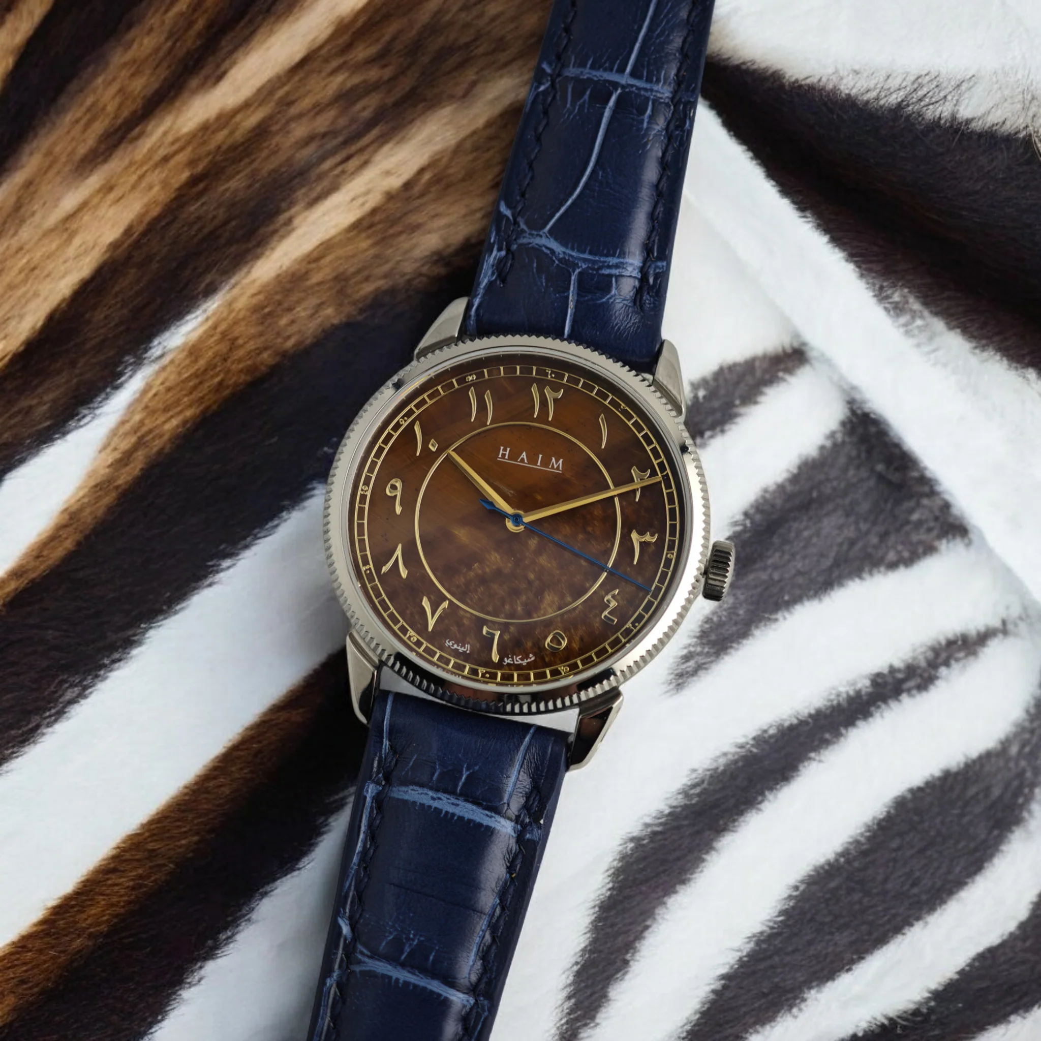 The Haim Legacy Automatic blends timeless design and modern craftsmanship in a 38mm titanium TA2 case. It features a striking Tiger’s Eye stone dial with full Arabic numerals and is powered by a US-assembled Caliber HWC-1 automatic movement, offering hacking seconds and a 38-hour power reserve. The watch has a 50m water resistance rating, sapphire crystal with five anti-reflective layers, and comes paired with a luxurious crocodile leather strap with quick-release technology.