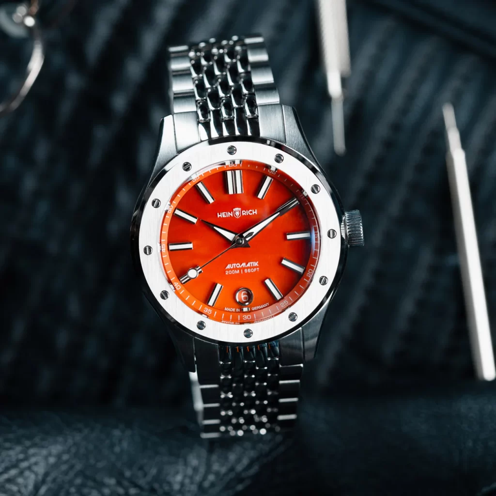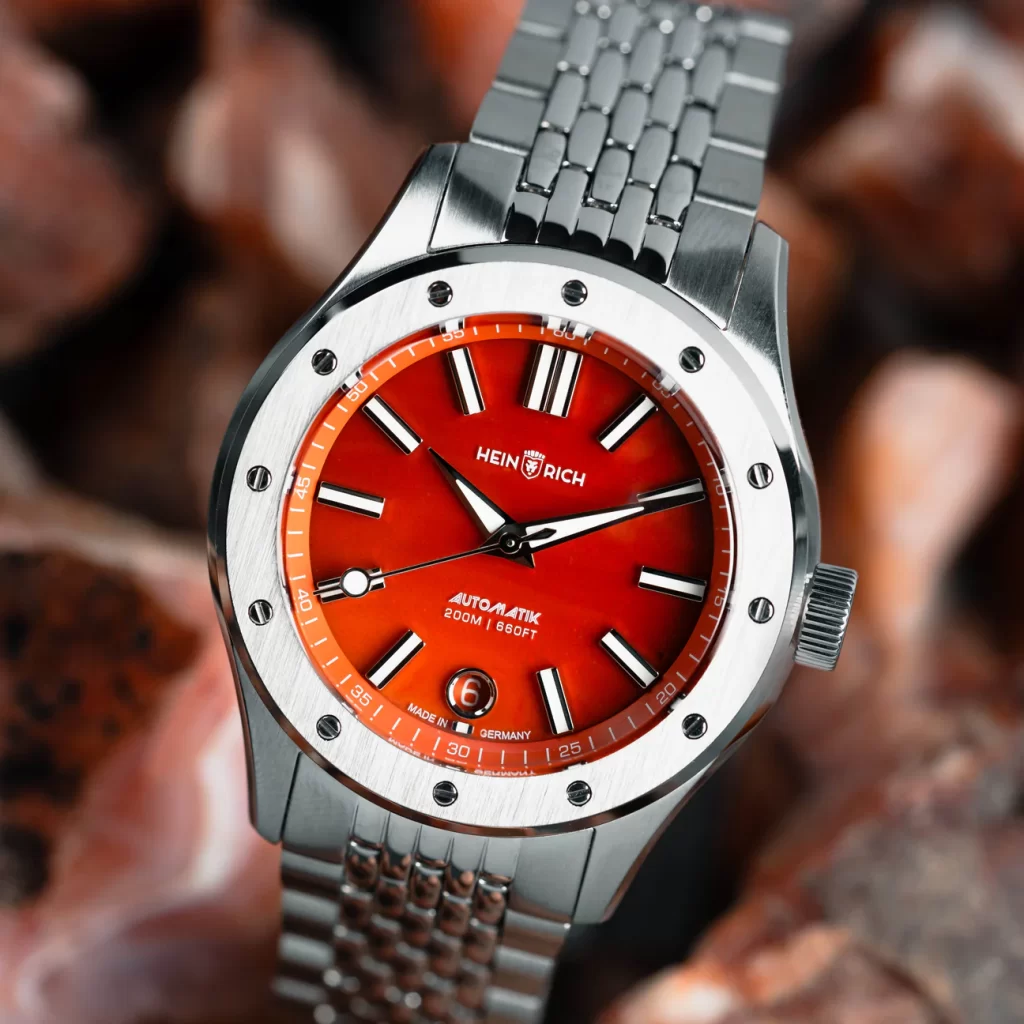 The Helicoprion Gemstone watch stands out with its unique dial options made from genuine lapis lazuli or carnelian gemstones. It features a brushed stainless steel case, measuring 40mm in diameter, and a box-shaped sapphire crystal with anti-reflective coating. The watch is powered by the Swiss-made Sellita SW200-1 Elaboré movement, offering precision and reliability. With a water resistance of 200 meters and a limited production of only 100 pieces, this timepiece is both functional and exclusive.