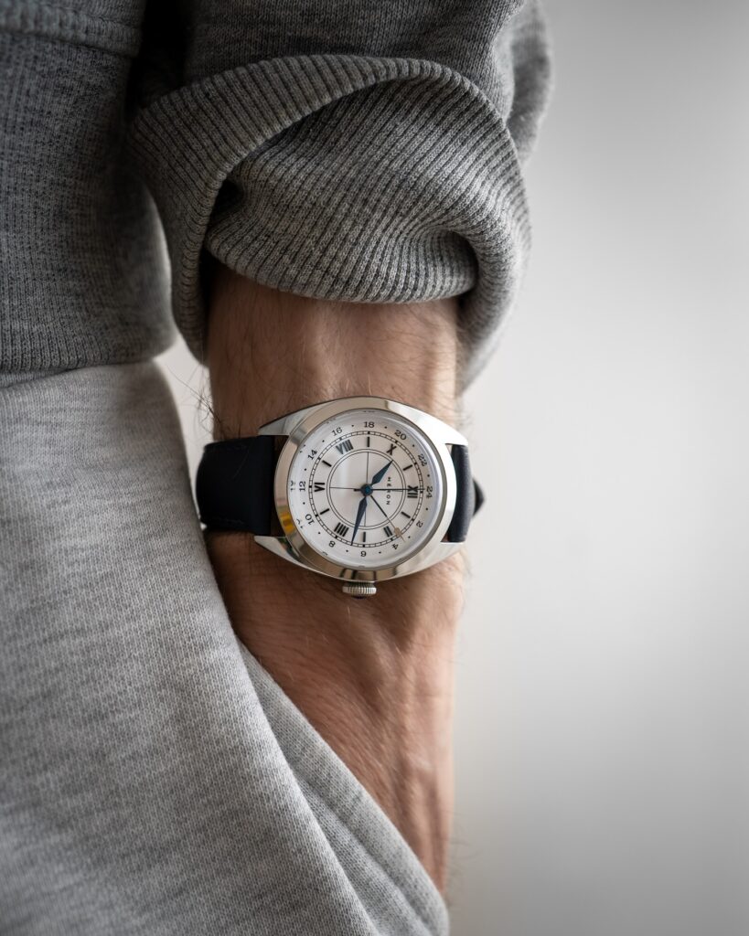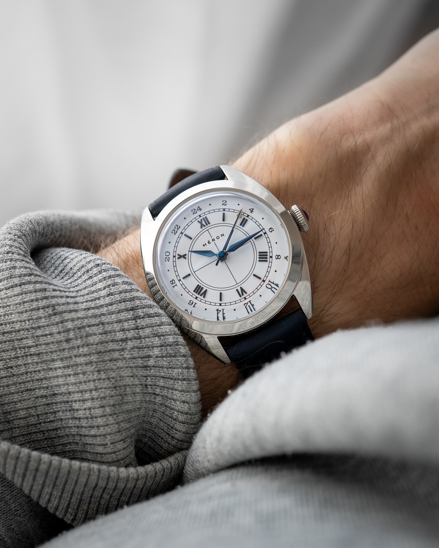 Héron redefines the GMT with the new Mirabel, a sophisticated dress watch that cleverly incorporates this beloved complication. Moving beyond sporty designs, the Mirabel features a classic C-shaped 316L stainless steel case and an exquisite enamel painted sector dial with polished applied numerals. Powered by an automatic “True GMT” Miyota 9075 movement, this timepiece boasts a boxed sapphire crystal and unique heated blue hands, making it a true conversation starter for any occasion.