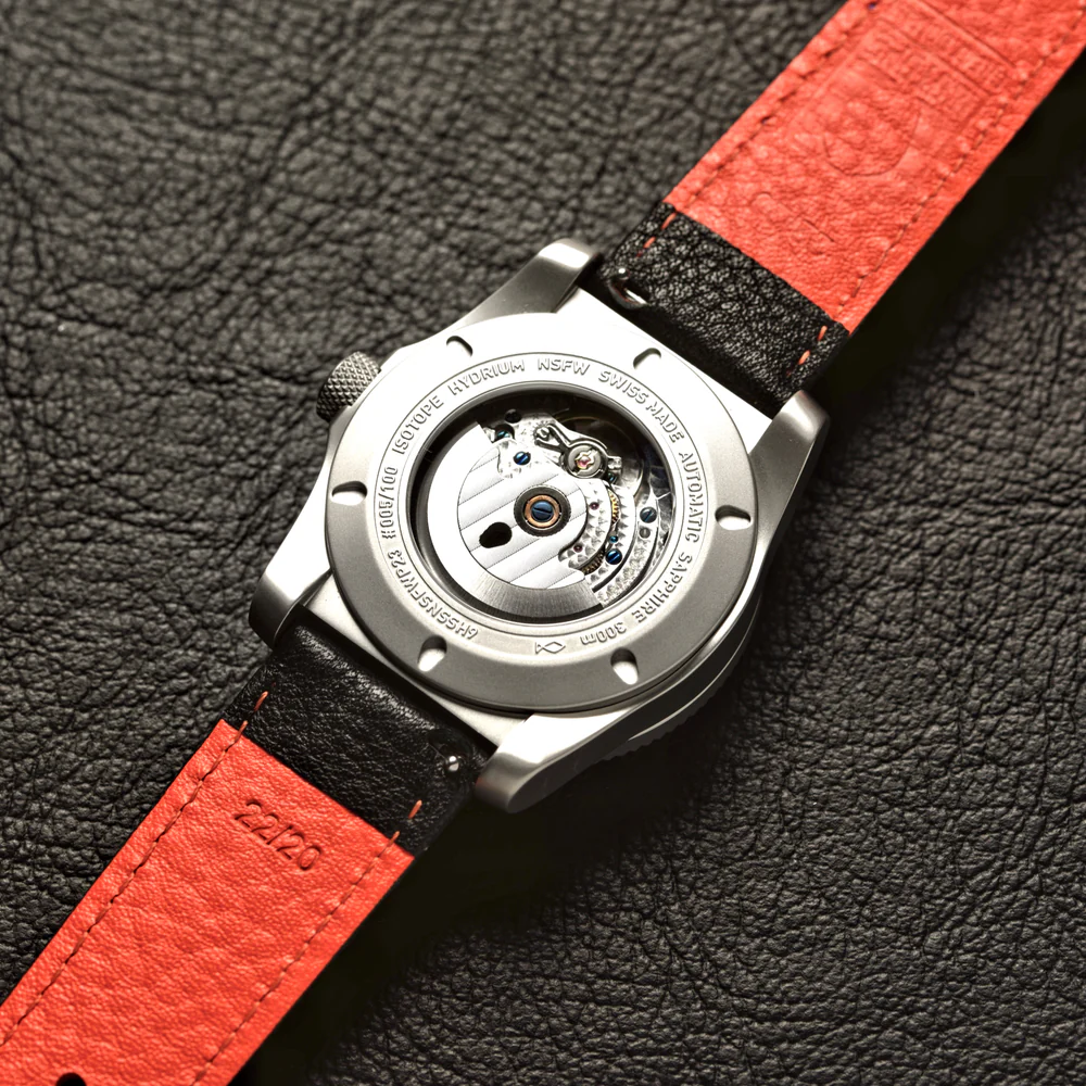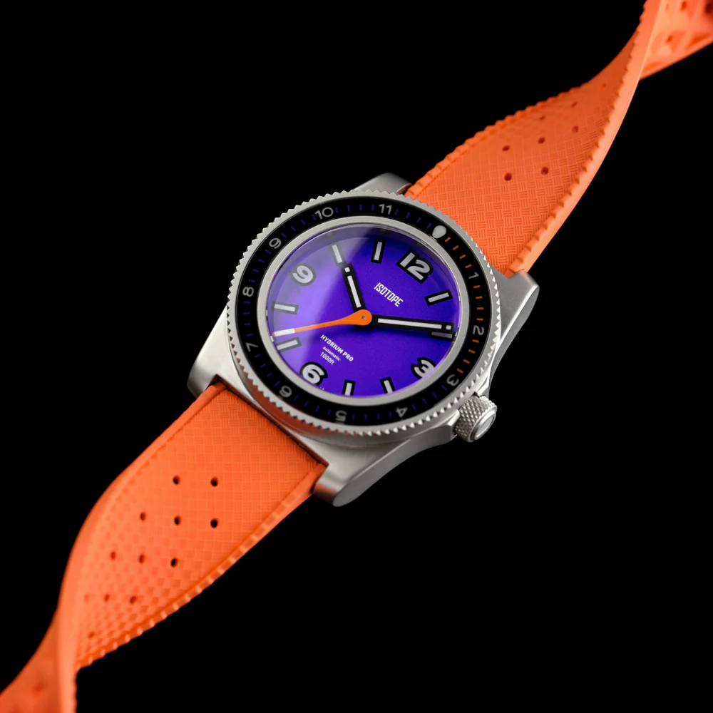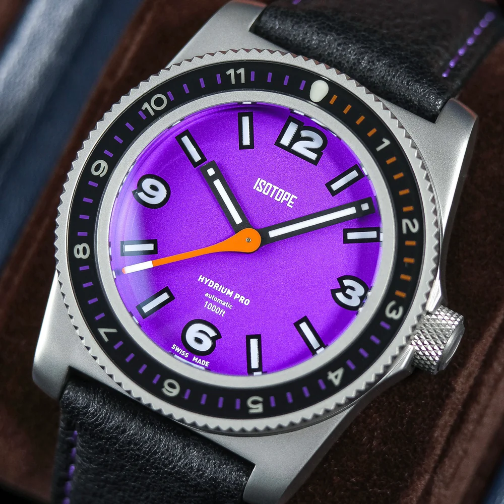 A bold statement in luxury and performance, the Isotope Hydrium® Pro NSFW exudes confidence with its striking Royal Purple dial and precision engineering. Encased in a 40mm micro-blasted 316L stainless steel case, this Swiss-made watch boasts a robust 300m water resistance and features a double-domed sapphire crystal with anti-reflective coating. Its Swiss Landeron mechanical movement, complete with blued screws and a 40-hour power reserve, ensures reliability. Equipped with quick-release leather and FKM straps, this timepiece offers versatility with flair.