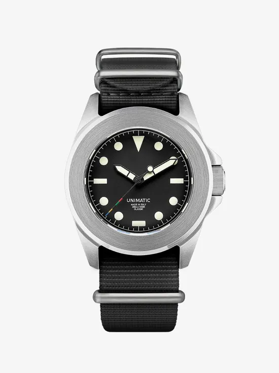 - Strap: Black heavy-duty Unimatic nylon NATO strap and four extra straps
