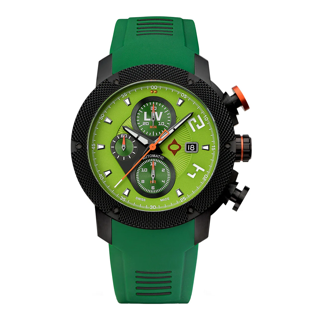 The LIV GX-AC Kermit exudes boldness with its striking green multi-layer dial and Swiss ETA 7750 automatic chronograph movement. Housed in a 46mm 316L stainless steel case with a black IP coating, this watch boasts a skeleton case back and scratch-resistant, anti-reflective sapphire crystal. With a 12-hour chronograph, 42-hour power reserve, and water resistance to 100m, it’s built for performance. Weighing 131.6g and featuring a screw-down crown, it’s both functional and durable.