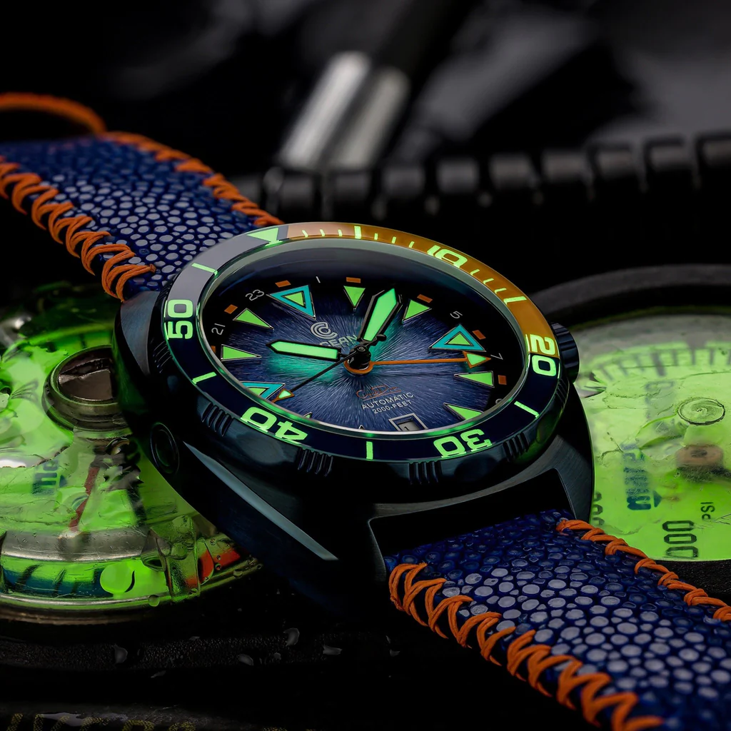 Ocean Crawler introduces the Core Diver GMT V3 Blue Steel DLC, a limited edition of 100 pieces per color (blue and green). This 44mm stainless steel watch features a sapphire unidirectional rotating bezel, a Sellita Caliber SW330-2 movement with a 42-hour power reserve, and water resistance up to 600 meters. The watch boasts Super-LumiNova markers for enhanced readability and a double-domed sapphire crystal with anti-reflective coating. Priced at $1,099 in pre-order, it comes with a plasma-assisted deposition case for hardness and scratch resistance.
