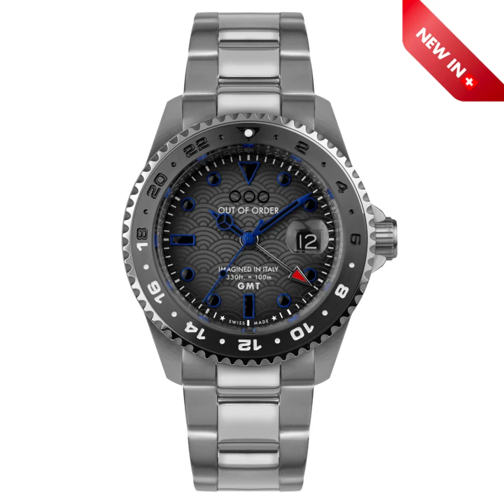 Out of Order Watches brings bold design and Swiss craftsmanship together with the new GMT Tokyo Shibuya Ultra Brushed. This timepiece stands out with its solid vertical brushed and ultra-polished 316L stainless steel case, measuring 44mm in diameter. Equipped with a Swiss Ronda 515 24h quartz movement, the watch also boasts a bi-directional turning bezel and a stunning sunburnt dark grey dial with luminous applied blue indexes. Designed for everyday adventures, it offers 10 ATM water resistance and comes with a robust full stainless steel bracelet.