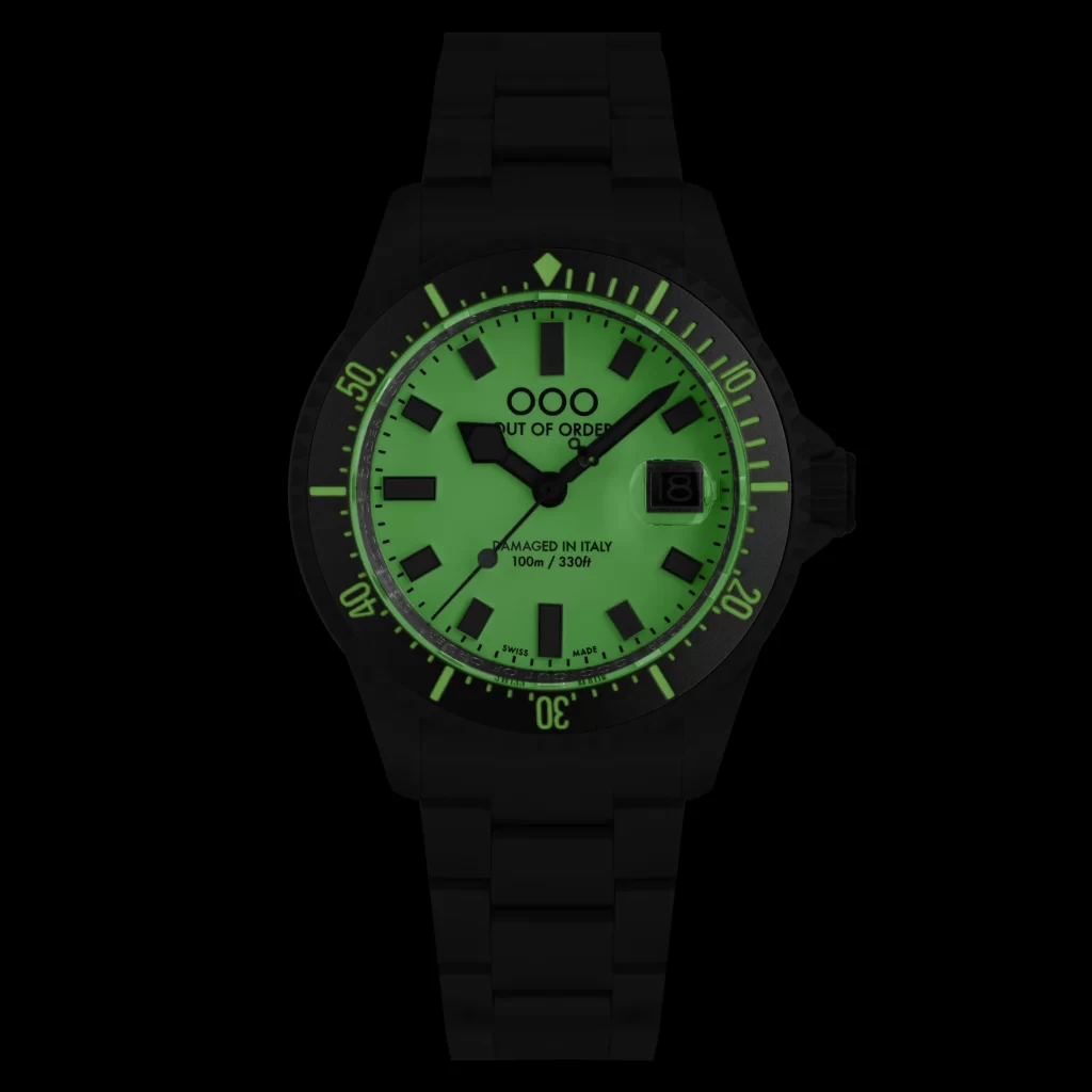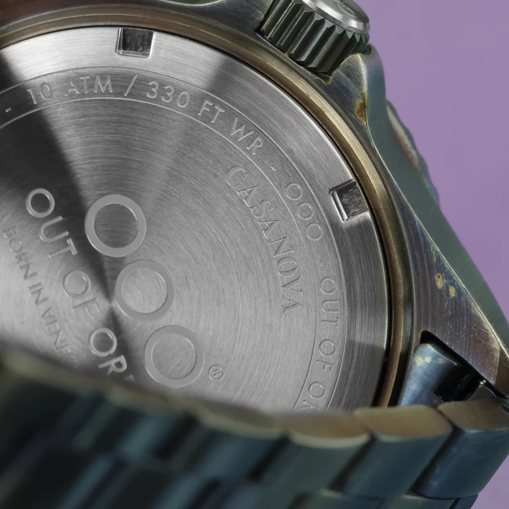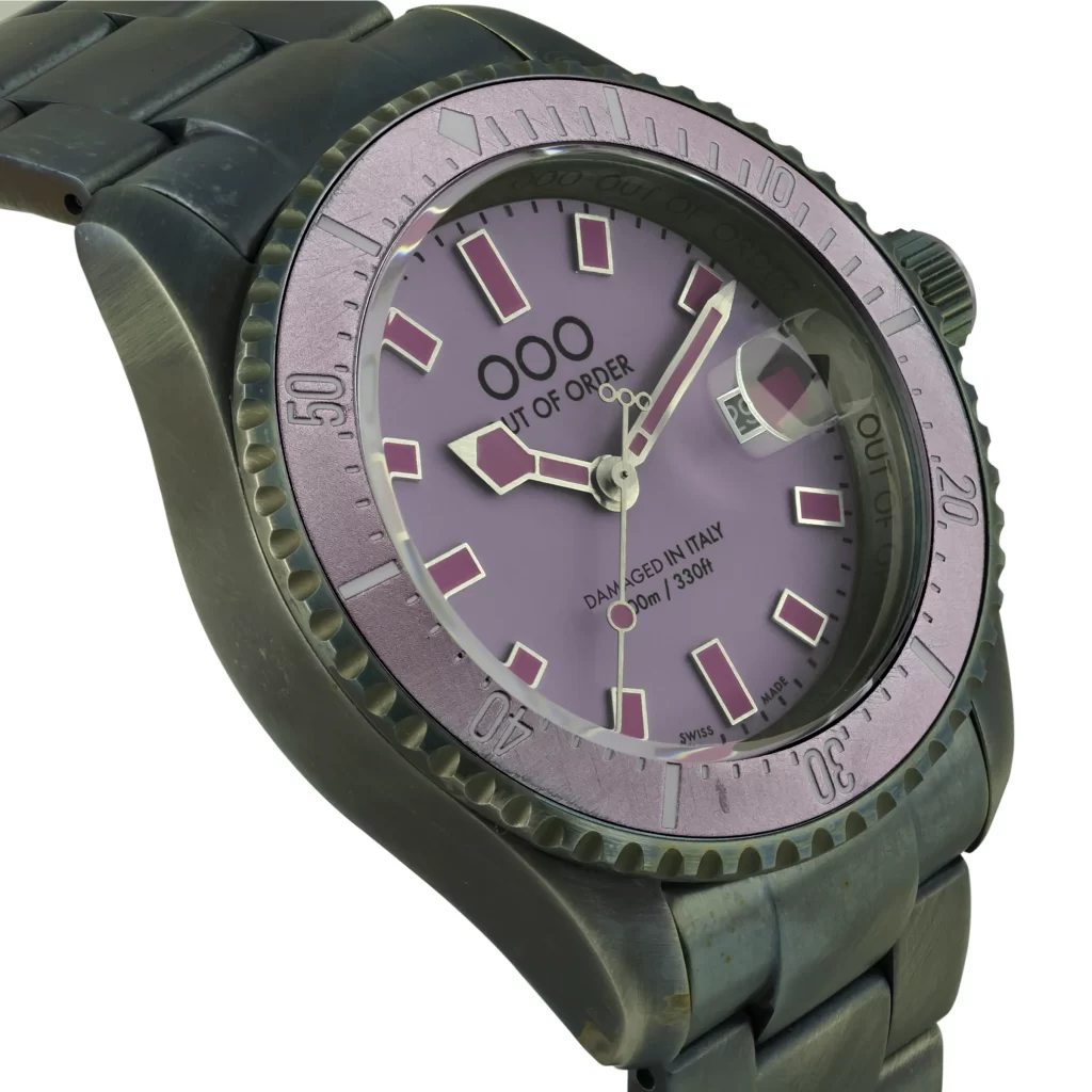 Experience the striking allure of the new Mirtillo Casanova from Out of Order, featuring a light purple full lume dial and dark purple bezel. Powered by a Swiss Ronda 515 quartz movement, this watch offers functions for hours, minutes, seconds, and date. Crafted from 316L stainless steel with a patented aging process, the 44mm case is both robust and stylish. It boasts 100m water resistance, a sapphire-coated crystal with magnifier, and a solid stainless steel band with a deployant clasp.