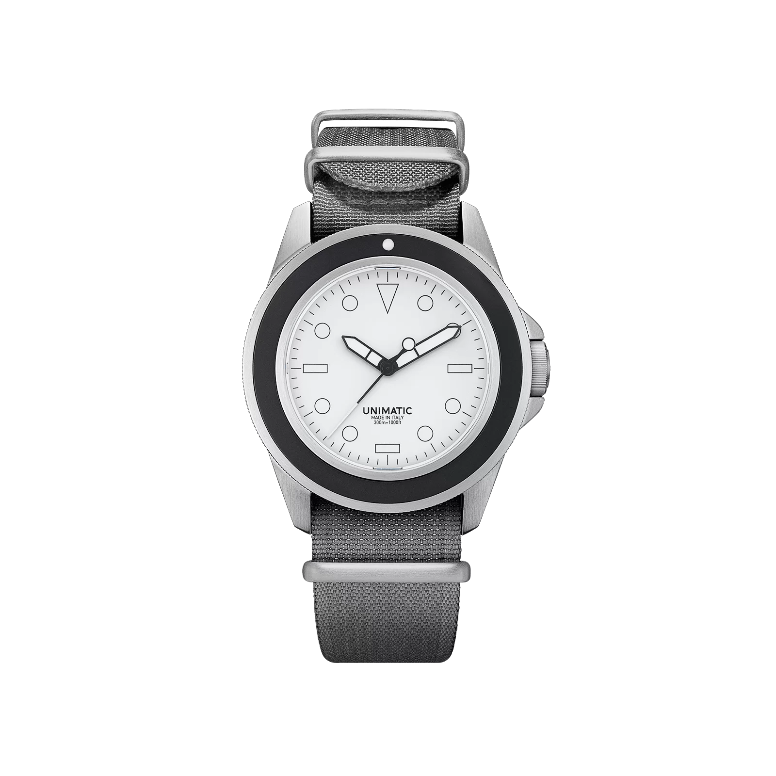 The Unimatic Modello Uno U1-FL is a striking dive watch, limited to just 100 pieces. Crafted from brushed 316L stainless steel, its 40mm case houses a Seiko NH35A automatic movement with a 41-hour power reserve. Featuring 300m water resistance, a 2.5mm double-domed sapphire crystal, and a matte black 24-hour bezel insert, the watch blends functionality with sleek design. The full-lume dial with Super-LumiNova® C1 ensures readability in all conditions, while the NATO strap adds durability.Specs: