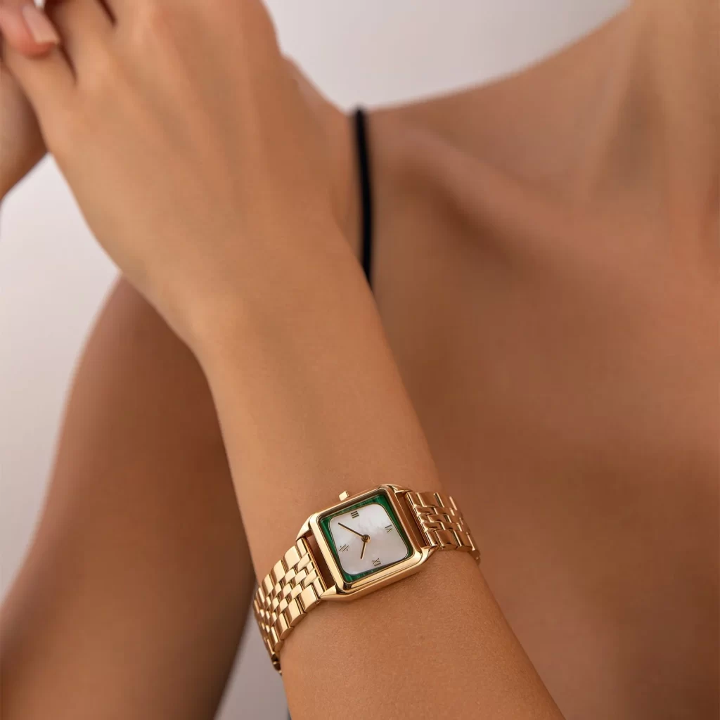 Elegant and timeless, the Geminus watch blends luxury with everyday wearability. Encased in stainless steel with 23k gold plating, this timepiece features a genuine pearl and malachite dial, adding a touch of sophistication to its design. Powered by a reliable Swiss Ronda quartz movement, it offers precision and durability. With a compact 25x22mm case and 3 ATM water resistance, the Geminus is both practical and stylish, making it a versatile accessory for any wardrobe.