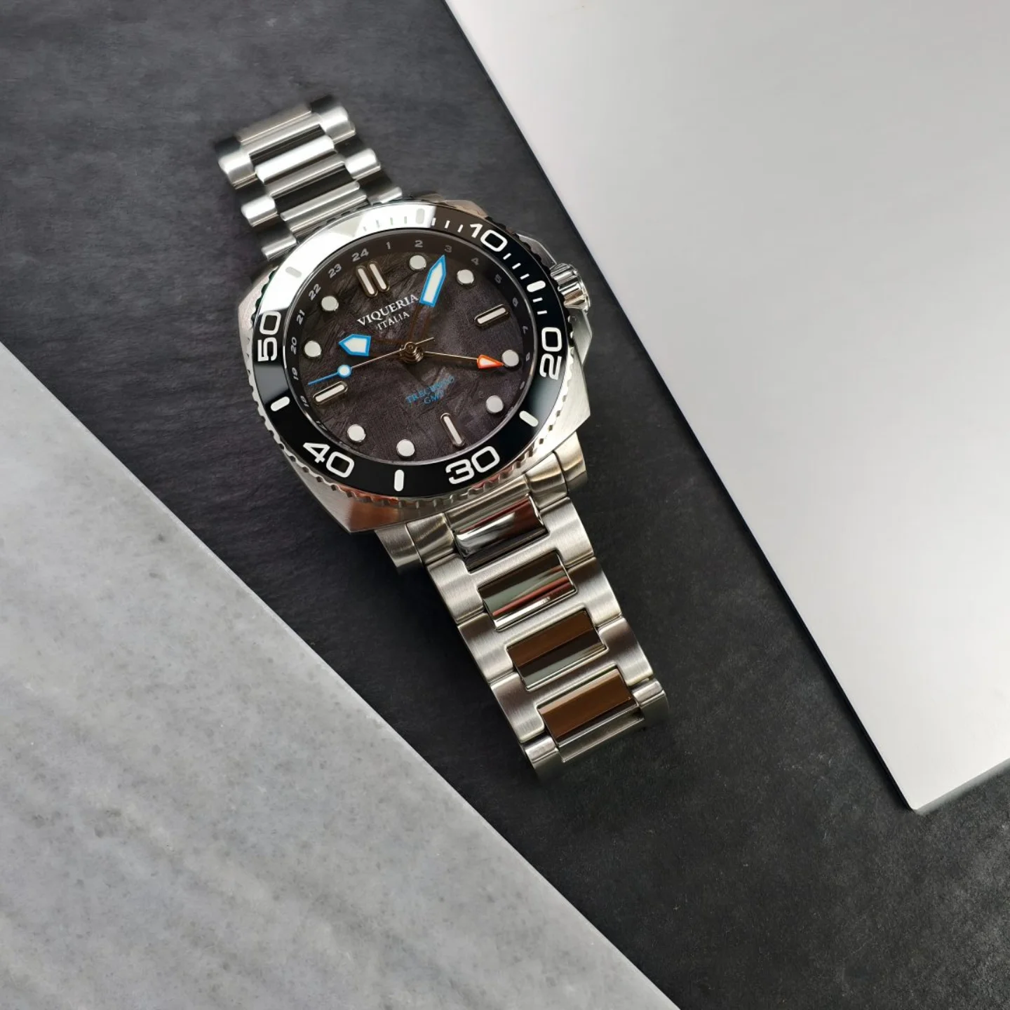 Viqueria presents a truly unique limited edition: the Trecento Natural Stone Dial Edition, featuring two extraordinary natural wonders on your wrist. Limited to just 100 pieces worldwide, collectors can choose between a genuine Muonionalusta Meteorite dial, with its distinctive Widmanstätten patterns, or a rare Purple Labradorite dial, showcasing iridescent violet and blue flashes. Beyond its stunning aesthetics, this professional-grade diver boasts 300m water resistance, an automatic GMT movement, a domed sapphire crystal, and a ceramic bezel, blending high performance with unparalleled elegance.